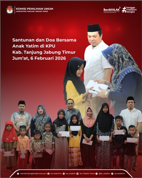 Muara Sabak, kab-tanjungjabungtimur.kpu.go.id - Komisi Pemilihan Umum (KPU) Kabupaten Tanjung Jabung Timur menggelar kegiatan pemberian santunan kepada anak-anak yatim yang berlangsung di Aula kantor KPU Kabupaten Tanjung Jabung Timur pada Jumat 6 Februari 2026. Kegiatan ini merupakan bentuk kepedulian sosial KPU terhadap sesama serta komitmen untuk terus menumbuhkan nilai-nilai kemanusiaan. Kegiatan tersebut dibuka langsung oleh Ketua KPU Kabupaten Tanjung Jabung Timur Hodijatul Qubro, didampingi anggota Juni Yanto, Irawan Sunarta serta dihadiri oleh Sekretaris Febriansyah Kurniawan, para Kepala Sub Bagian dan staf Sekretariat KPU Kabupaten Tanjung Jabung Timur. Acara berlangsung dalam suasana hangat dan penuh kekeluargaan, menghadirkan rasa haru sekaligus kebersamaan yang mencerminkan solidaritas keluarga besar KPU Kabupaten Tanjung Jabung Timur dalam berbagi kasih terhadap sesama dalam bentuk Pemberian Santunan dan Doa Bersama Anak Yatim. Santunan diserahkan secara langsung kepada anak-anak yatim sebagai bentuk perhatian dan dukungan moral. Dengan kegiatan ini, diharapkan dapat memberikan kebahagiaan, motivasi, serta semangat bagi mereka dalam menjalani kehidupan dan meraih cita-cita yang diimpikan untuk masa depan. KPU Kabupaten Tanjung Jabung Timur menegaskan komitmennya untuk tidak hanya menjalankan tugas dan fungsi sebagai penyelenggara pemilu, namun juga berperan aktif membangun empati, kepedulian sosial di tengah masyarakat sebagai bahagian dari bukti bahwa KPU membangun kepedulian terhadap lingkungan sekitar kepada anak yatim. ....