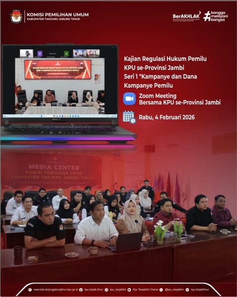 Muara Sabak, kab-tanjungjabungtimur.kpu.go.id - Komisi Pemilihan Umum (KPU) Kabupaten Tanjung Jabung Timur mengikuti Kajian Regulasi Hukum Pemilu KPU se-Provinsi Jambi Edisi Pertama dengan judul kajian “Tahapan Kampanye dan Dana Kampanye Pemilu 2024 di Kabupaten Batang Hari: Harmonisasi Norma dan Analisis Kesenjangan Implementasi”. Kegiatan kajian regulasi perdana ini dilaksanakan pada Rabu, 4 Februari 2026, yang dihadiri oleh Ketua dan Anggota, Sekretaris, Para Kasubbag dan Staf KPU Kabupaten Tanjung Jabung Timur secara daring. Kegiatan diskusi dan pemaparan kajian ini menjadi wadah strategis dalam menghimpun berbagai masukan substantif dari KPU Kabupaten/Kota terkait penyusunan regulasi kepemiluan. Melalui pemaparan kajian dan diskusi interaktif, diperoleh pandangan yang komprehensif mengenai tahapan kampanye dan dana kampanye Pemilu 2024, khususnya dalam aspek harmonisasi norma dan kesenjangan implementasi di daerah. Seluruh masukan yang dihimpun diharapkan dapat menjadi pandangan bersama KPU Provinsi Jambi serta digunakan sebagai bahan masukan yang konstruktif bagi KPU RI dalam penyusunan dan penyempurnaan regulasi kepemiluan ke depan. ....