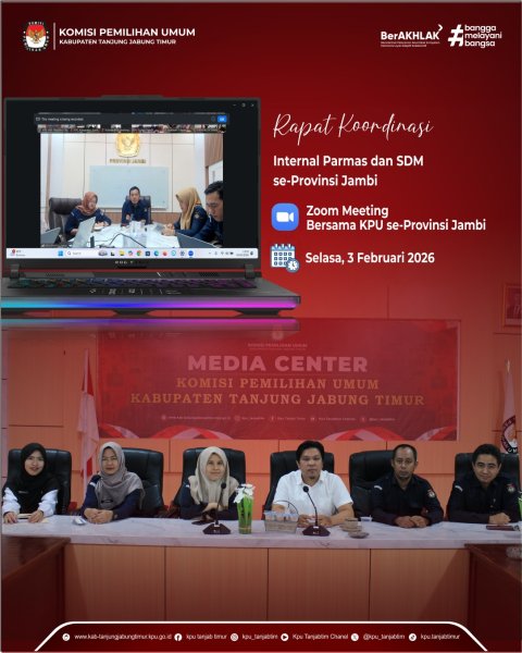 Muara Sabak, kab-tanjungjabungtimur.kpu.go.id - Komisi Pemilihan Umum (KPU) Kabupaten Tanjung Jabung Timur melaksanakan Rapat Koordinasi Internal Divisi Partisipasi Hubungan Masyarakat dan SDM yang mencakup fungsi kehumasan dan sdm, bertempat di Aula KPU Kabupaten Tanjung Jabung Timur secara daring, Selasa (03/02/26). Kegiatan ini dilaksanakan sebagai upaya penguatan koordinasi internal dalam pelaksanaan tugas dan fungsi divisi. Rapat koordinasi tersebut membahas perencanaan program dan inovasi kegiatan ke depan, sekaligus melakukan evaluasi terhadap pelaksanaan kegiatan yang telah dilaksanakan sebelumnya. Pembahasan difokuskan pada peningkatan efektivitas program kerja, strategi komunikasi publik, serta penguatan peran KPU Kabupaten Tanjung Jabung Timur dalam penyampaian informasi kepemiluan kepada masyarakat. Melalui rapat koordinasi ini, diharapkan terwujud keselarasan perencanaan dan pelaksanaan program kerja yang berorientasi pada peningkatan kualitas layanan informasi kepemiluan, penguatan partisipasi masyarakat, serta peningkatan kinerja kelembagaan KPU Kabupaten Tanjung Jabung Timur. ....