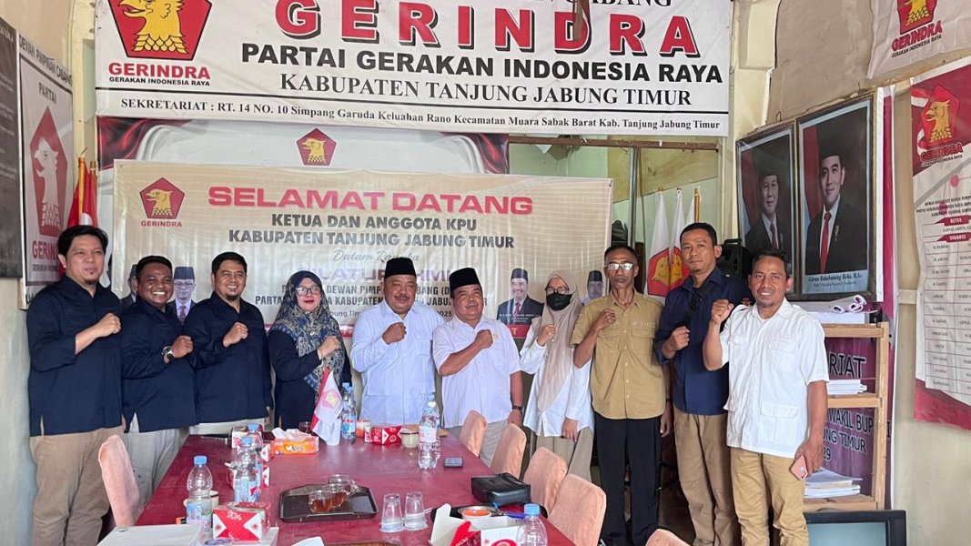 Muara Sabak - Komisi Pemilihan Umum Kabupaten Tanjung Jabung Timur melaksanakan kegiatan Silaturahmi dan Audiensi bersama pengurus partai politik ke kantor DPC Partai Gerindra Kabupaten Tanjung Jabung Timur pada hari selasa, 14 Oktober 2025, Agenda ini merupakan rangkaian kegiatan pasca Pemilu dan Pemilihan Tahun 2024 yang bertujuan sebagai ajang perkenalan jajaran pimpinan KPU Kabupaten Tanjung Jabung Timur dengan pengurus partai politik.