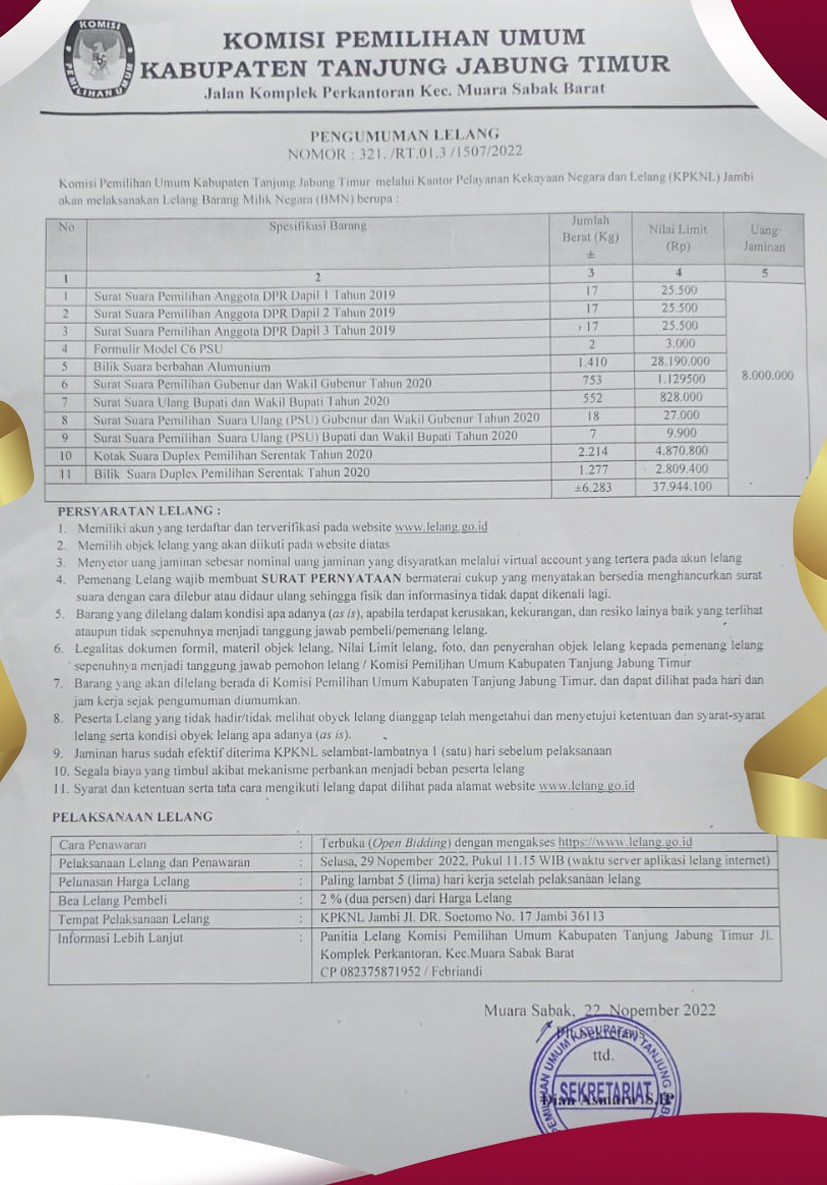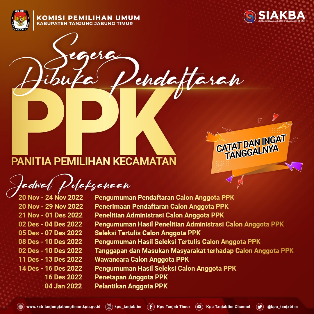 Berdasarkan Berita Acara Rapat Pleno KPU Tanjung Jabung Timur Nomor : 88/PP.04.1-BA/1507/2022 Tentang Hasil Penelitian Administrasi Calon Anggota Panitia Pemilihan Kecamatan (PPK) Untuk Pemilihan Umum Tahun 2024 Tanggal 1 Desember 2022, dengan ini diumumkan Hasil Penelitian Administrasi Calon Anggota Panitia Pemilihan Kecamatan (PPK) Untuk Pemilihan Umum Tahun 2024 sebagai berikut: Hasil seleksi administrasi nama-nama calon Anggota Panitia Pemilihan Kecamatan Untuk Pemilihan Umum Tahun 2024 yang memenuhi syarat administrasi adalah sebagaimana tercantum dalam lampiran pengumuman ini; Komisi Pemilihan Umum Kabupaten Tanjung Jabung Timur menerima tanggapan dan masukan dari masyarakat terhadap hasil seleksi nama-nama calon Anggota Panitia Pemilihan Kecamatan (PPK) Untuk Pemilihan Umum Tahun 2024 hasil penerimaan pendaftaran seleksi calon Anggota Panitia Pemilihan Kecamatan (PPK) Untuk Pemilihan Umum Tahun 2024 dalam wilayah Kabupaten Tanjung Jabung Timur dari tanggal 2 s.d 10 Desember 2022; Penerimaan tanggapan dan masukan masyarakat sebagaimana dimaksud pada angka 2 dapat disampaikan langsung ke Kantor KPU Kabupaten Tanjung Jabung Timur tanggal 2 s.d 10 Desember 2022 pukul 08.00 s.d 16.00 WIB melalui Helpdesk Pembentukan PPK terhadap hasil seleksi calon Anggota Panitia Pemilihan Kecamatan Untuk Pemilihan Umum Tahun 2024. Jadwal dan Tempat Tes Tertulis akan diberitahukan kemudian. untuk melihat siapa yang lulus dalam seleksi administrasi calon anggota PPK untuk pemilihan umum tahun 2024 dapat download disini
