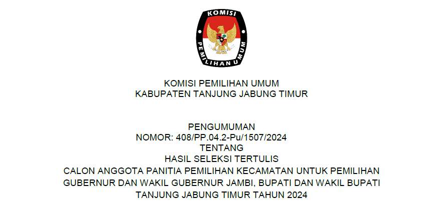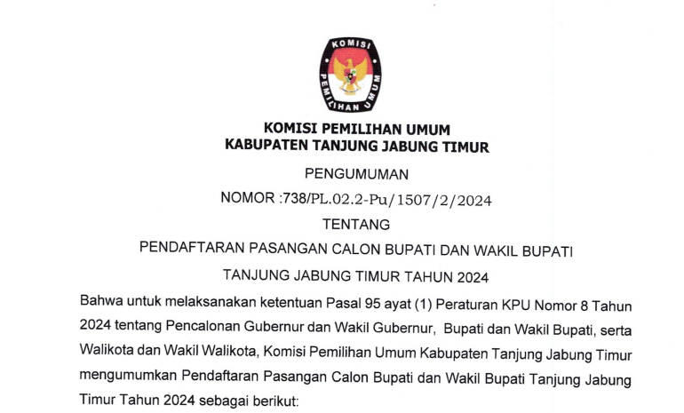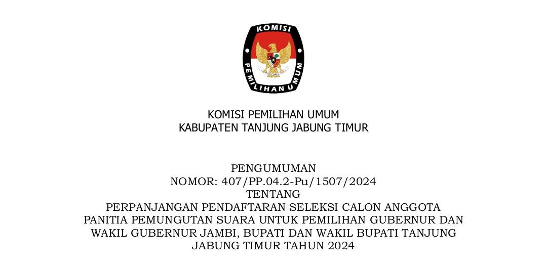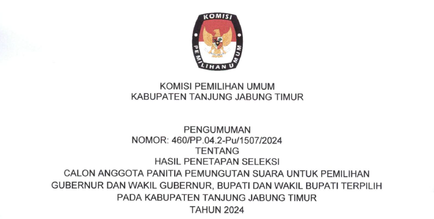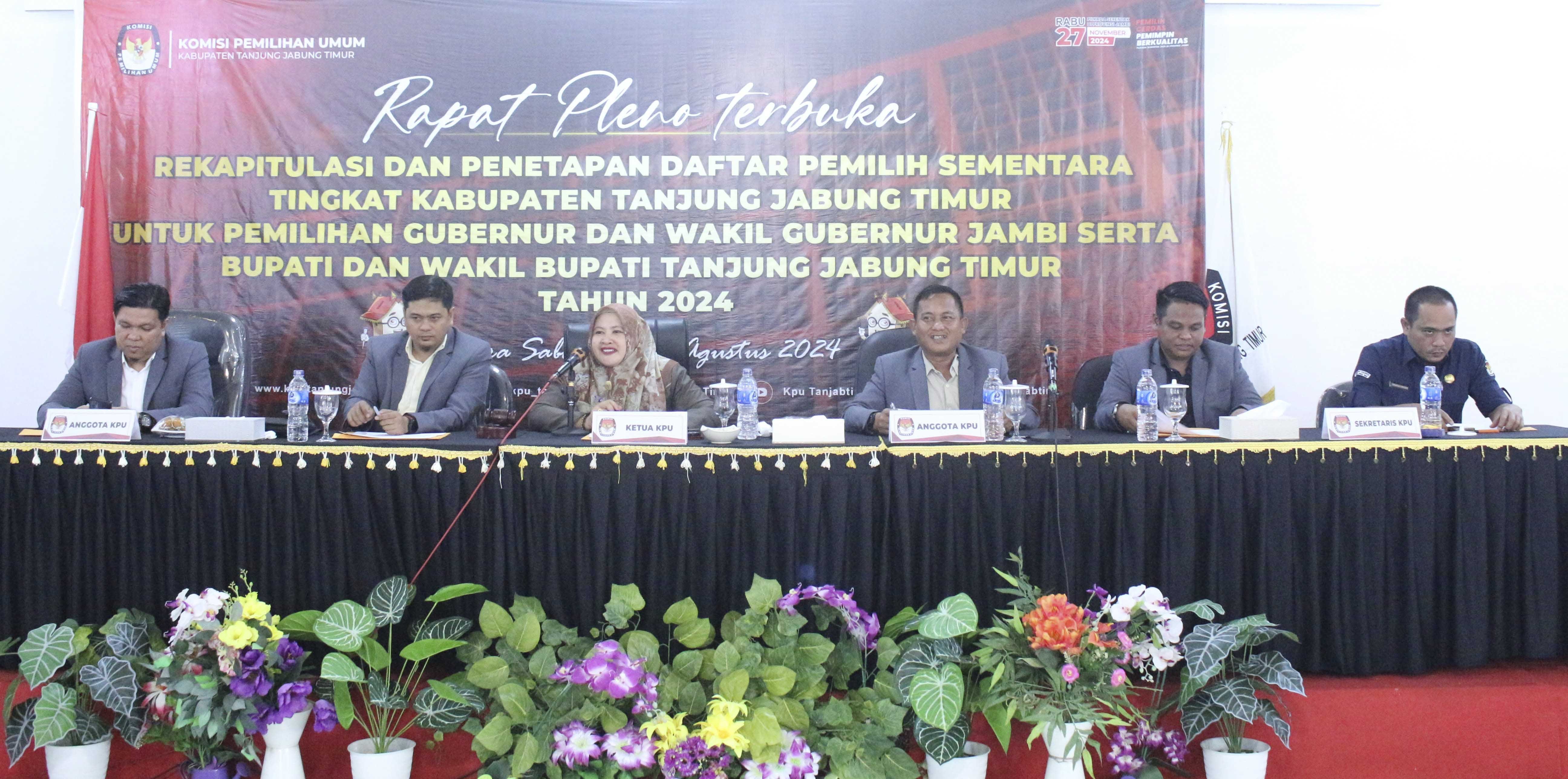 KOMISI Pemilihan Umum Kabupaten Tanjung Jabung Timur melakukan rekapitulasi Daftar Pemilih Sementara (DPS), Minggu (11/8) di Hotel Ratu Muara Sabak. Total ada 507 Tempat Pemungutan Suara (TPS) dan 175.242 pemilih dalam Daftar Pemilih Sementara berdasarkan rekapitulasi dan penetapan DPS yang dilakukan oleh KPU Kabupaten Tanjung Jabung Timur. Dari 507 TPS tersebut, terdapat 1 TPS lokasi khusus yang berada di Lembaga Pemasyarakatan Narkotika Kelas IIB Maura Sabak yang berada di Kecamatan Geragai Desa/Kelurahan Suka Maju. Sedangkan dari 175.242 pemilih, terdiri dari 89.115 pemilih laki-laki dan 86.127 pemilih perempuan. Dan Alhamdulillah pada hari ini, Minggu (11/08/2024) pelaksanaan rapat pleno terbuka dps Kabupaten Tanjung Jabung Timur tahun 2024 berjalan dengan aman dan lancar.Terima kasih kepada rekan rekan PPK dan PPS atas kerjasama nya yg baik.Kemudian dari rekan rekan Bawaslu juga atas pengawasannya, sehingga semua tahapan tahapan ini berjalan dengan aman dan lancar.”terang Khodijatul Qubro. Turut hadir Perwakilan dari Polres Tanjabtim yang diwakili oleh KBO Ipda. Erwin, Kejari Tanjabtim yang diwakili oleh Staff Intelijen Hillary Sarah, SH, Dandim 0419/Tanjab yang diwakili oleh Bati Intel Pabung Dim 0419/Tanjab Peltu. Sena Candra Suseno, Kadis Dukcapil yang diwakili oleh Bina Program Roro Aditya Ningrum, Kaban Kesbangpol yang diwakili oleh Kabid Wasnas Slamet Nugroho, SE, Kepala Lapas Klas IIB NARKOTIKA Muara Sabak Dwi Hartono, Ketua Bawaslu Kabupaten Tanjabtim Tarmuzi, S.Pd.I, Syakur Rahman, S.Pd, para ketua PPK se Kabupaten Tanjung Jabung Timur beserta anggotanya, rekan rekan KPU Kabupaten Tanjung Jabung Timur, Sekretaris,kasubbag dan staff KPU Kabupaten Tanjung Jabung Timur.