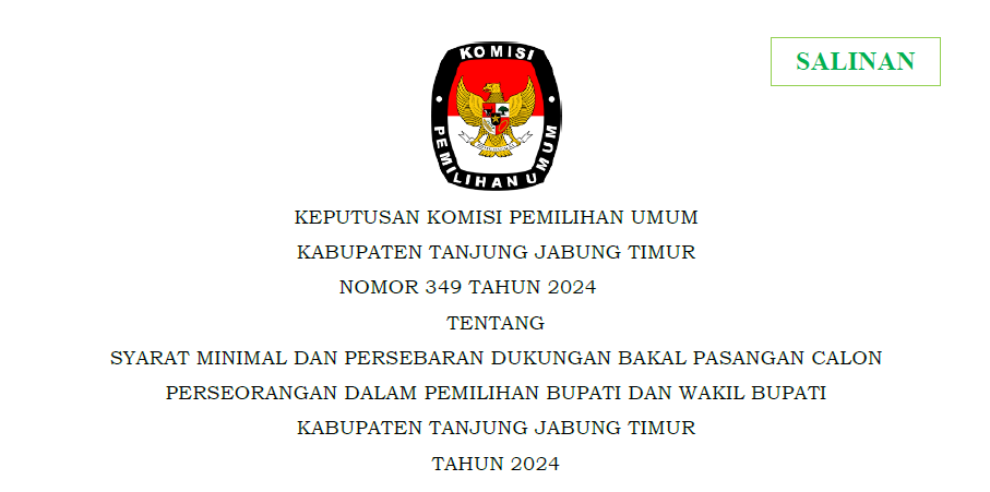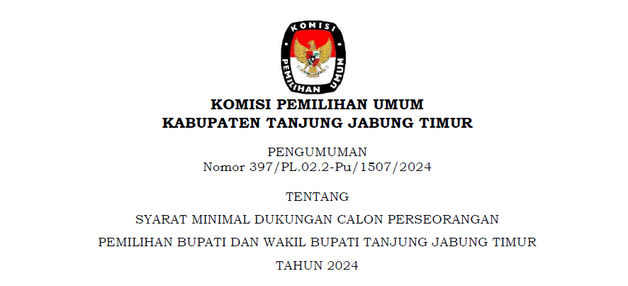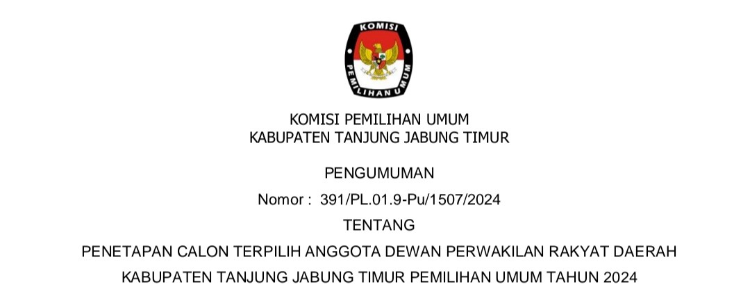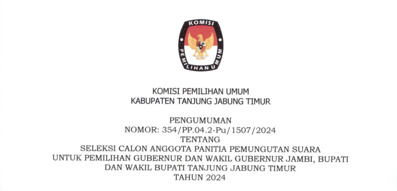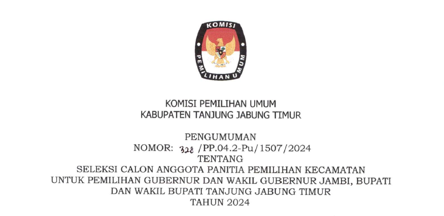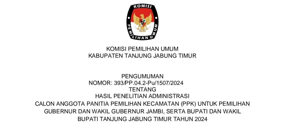 Komisi Pemilihan Umum Kabupaten Tanjung Jabung Timur telah melaksanakan tahapan Penelitian Administrasi Calon Anggota Panitia Pemilihan Kecamatan (PPK) untuk Pemilihan Gubernur dan Wakil Gubernur Jambi, serta Bupatid an Wakil Bupati Tanjung Jabung Timur Tahun 2024