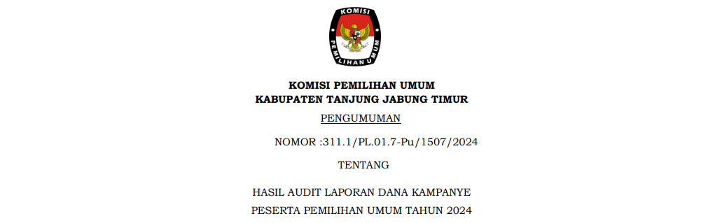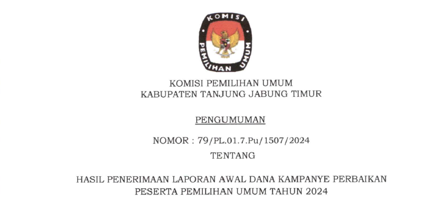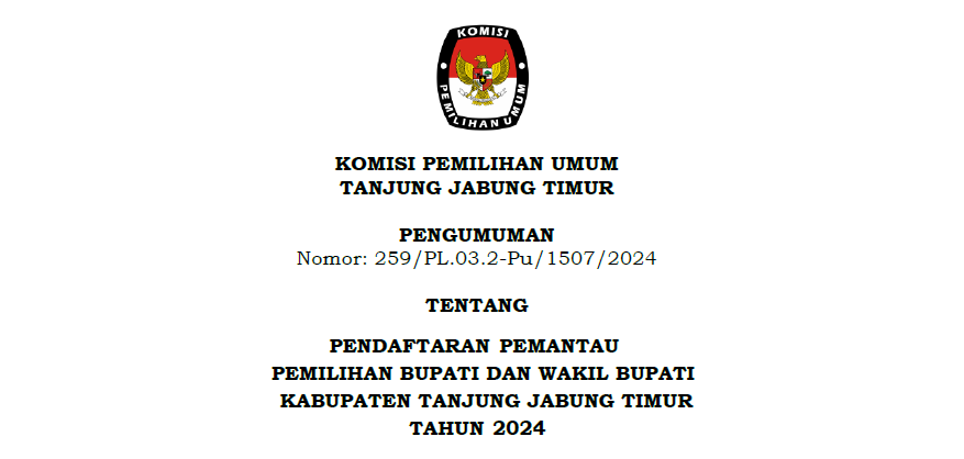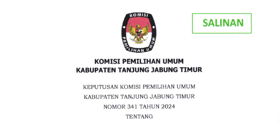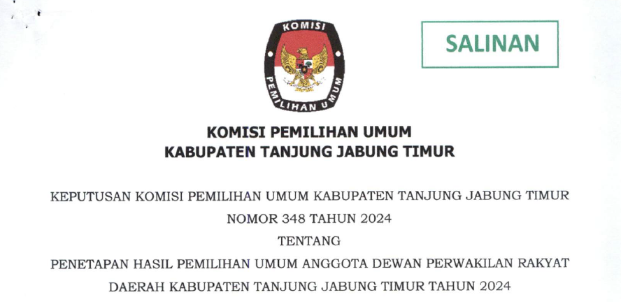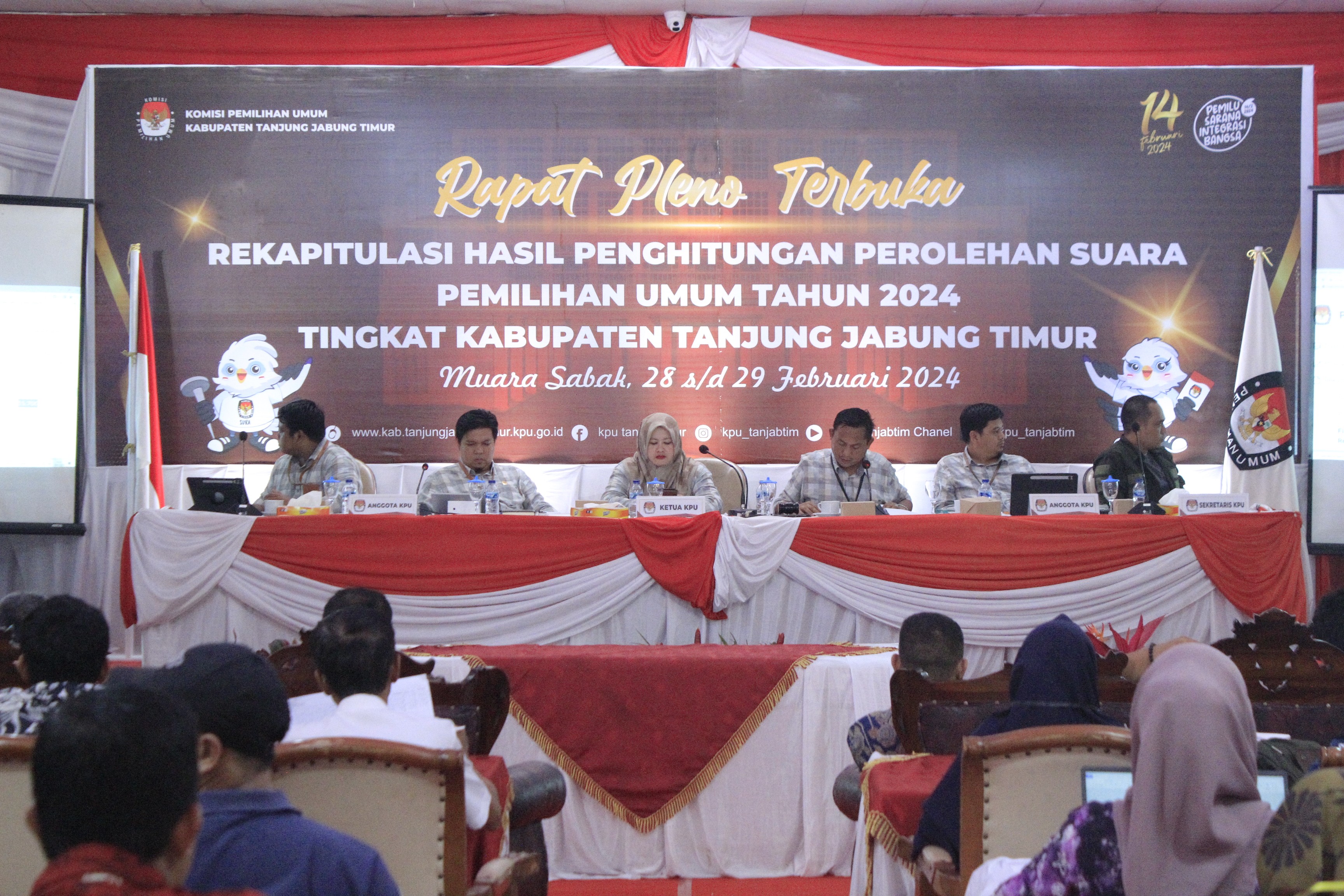 Komisi Pemilihan Umum Kabupaten melaksanakan Rapat Pleno Terbuka Rekapitulasi Perolehan Suara di Aula KPU Kabupaten Tanjung Jabung Timur, Ketua KPU Kabupaten Tanjab Timur, Hodjiatul Qubro, S.Pd.I, memimpin rapat tersebut yang dihadiri oleh berbagai pihak terkait, termasuk Wakil Bupati Tanjab Timur Roby Nahliansyah, S.H, Pabung 0419/Tanjab Mayor Inf. Ahmad Riadh, S.Ag, dan sejumlah tokoh utama seperti Kasat Intelkam Polres Tanjab Timur Akp Satiyo, S.H., M.H. Rapat ini juga dihadiri oleh para Komisioner KPU, Ketua Bawaslu Kabupaten Tanjab Timur Tarmuzi S. Pd.i, serta perwakilan dari berbagai tingkatan kecamatan.