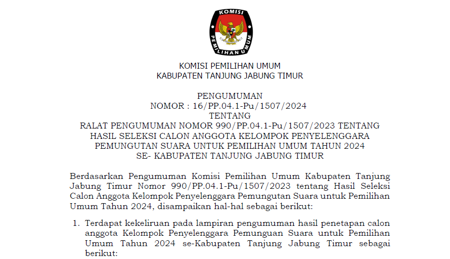 Berdasarkan Hasil Seleksi Calon Anggota Kelompok Penyelenggara Pemungutan Suara untuk Pemilu Tahun 2024, disampaikan hal-hal sebagai berikut: